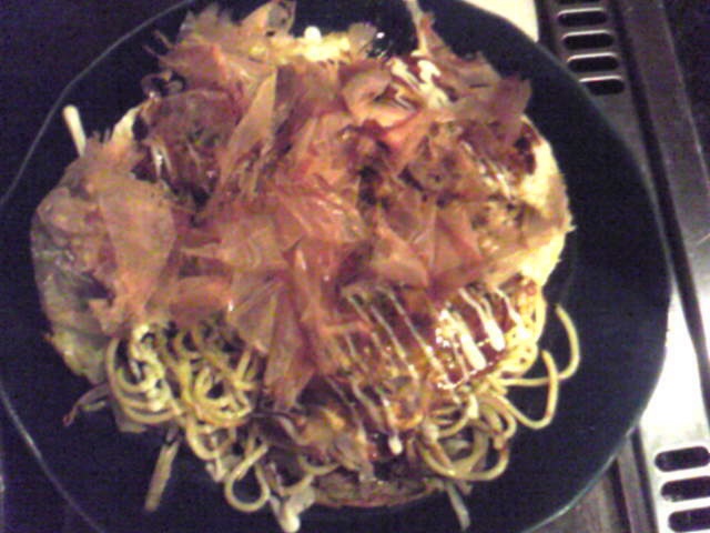 基本的な「お好み焼き」。いつもは卓上鉄板で焼いて食べるのですが、乳幼児二人連れだったのでお店の方で焼いてもらいました。