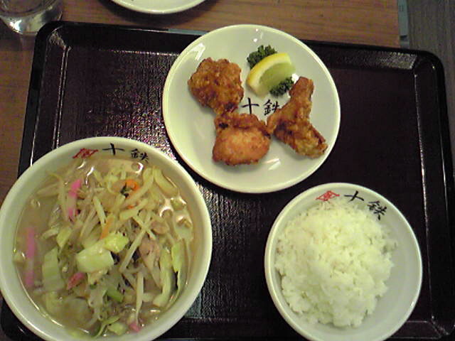 スープは野菜と鶏の出汁でとってもアッサリとしています。麺は、ちゃんぽんの割には細めで少々ブチブチっとしていました。ちゃんぽんの具はにんじん・もやし・イカ・かまぼこ・豚肉等、ちゃんぽんの基本はバッチリ入っていました。唐揚げは醤油でちゃんと下味がつけられておりカラっと揚がっていて美味しかったです。ご飯の量を大中小選べてしかも値段が同じ所が良いです◎
