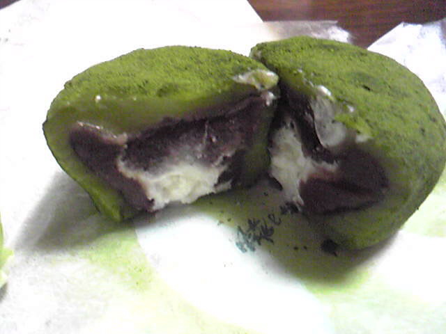 中央には生クリーム、それをこしあん・抹茶を練り込んだお餅、