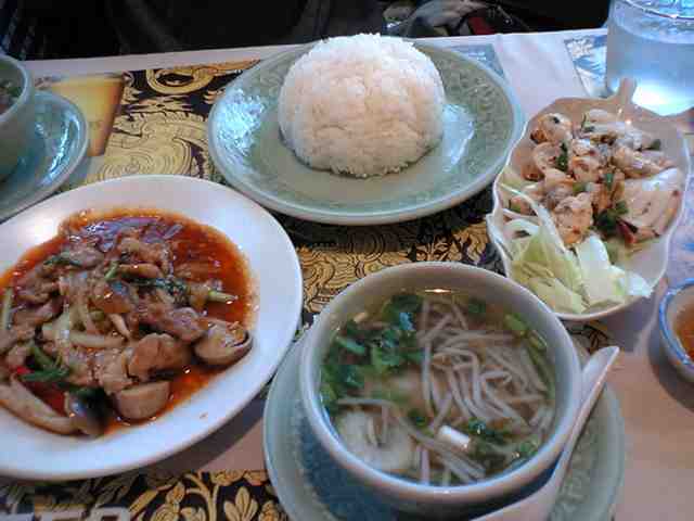 日替わりランチ。この日は蒸し鶏レモングラス風味と豚肉の炒め物、それにさきほどのスープとごはん・デザート。量は割と多めで値段との釣り合いはとれていると思う。蒸し鶏はサッパリとチキンサラダみたいな感じで、豚肉の炒め物は辛味噌が効いているパンチのある味。ごはんにのっけていただきたい。
