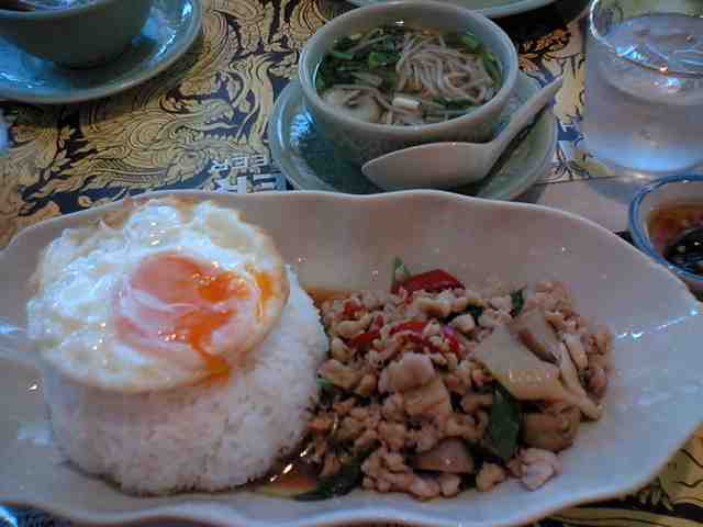 ナンプラーと唐辛子の効いた鶏そぼろと、香りの良いバジル、たけのこ、パプリカを一緒に炒めてある。辛さはちょっとピリっとする程度。といってもおそらく、子どもにはちょっとキツいと思う。半熟目玉焼きの黄身も一緒に混ぜていただくと