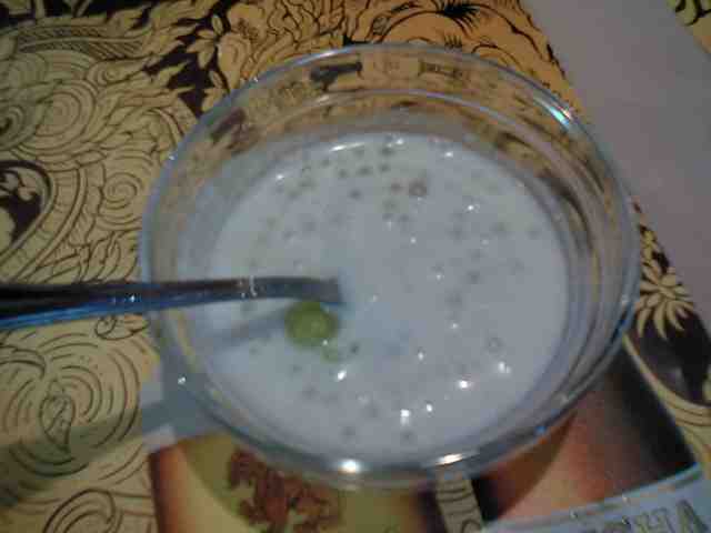 小麦粉麺にナンプラーで味付けされた焼きそば。こちらは「中華風」なので全然辛くない。ちょっと甘めの味付け。野菜がたくさん入っていて量もなかなかに多い。デザートはタイ料理ではおなじみのタピオカココナッツ。甘くて、ちょっと塩味もして、食後の口はサッパリ。