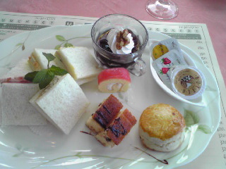サンドイッチは4種類で・苺とクリームチーズ・サーモンとケイパーとピクルス・ツナ・卵。真ん中はデザート3種類。上からコーヒーゼリー・苺ジャムのロールケーキ・ドライフルーツのパウンドケーキ。そして一番右はスコーン、ジャム、バター。いかにもホテルの朝食で出されそうな感じで、味も至って普通。デザート3種類関しては、コーヒーゼリーのデコレーションが思いっきり植物性ホイップだったのが非常に残念。ちょっとベタっともたれてしまった。ロールケーキの中のクリームも同様。パウンドケーキはかなりポロポロしている。スコーンはしっとりしていて香りもよく、一緒に来たバターもちゃんと100%乳脂だった