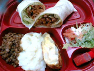 タコスにレンズ豆・マッシュポテト・サラダ・スペイン風