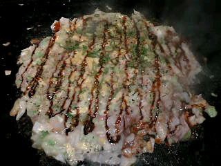 ソースは結構辛めな印象。下のお好み焼き生地に