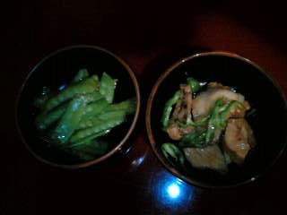 お通し 右:魚の南蛮漬け 左:さやえんどうのおひたし