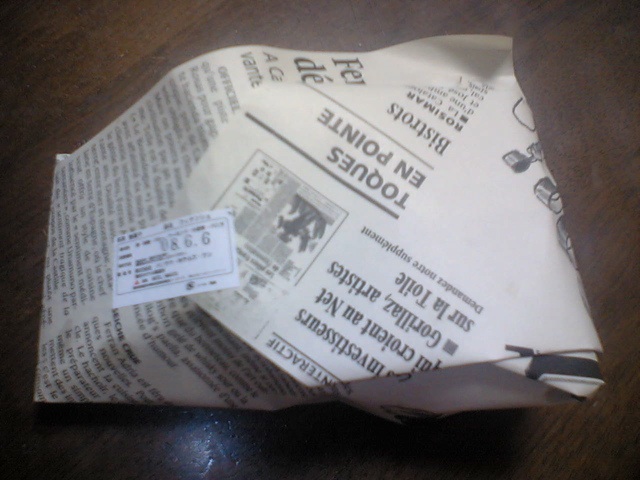 その場で焼きたて・出来立てを上記写真のように英字新聞にくるんで