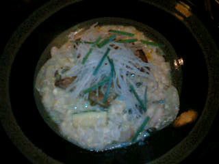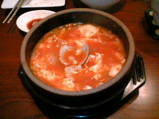 柔らかい白豆腐のことを韓国では『純豆腐-スンドゥブ-』と呼ぶ。それが海鮮の出汁とともにたくさん入っていて、卵でとじてある。写真は(子ども付きだったため)辛さはほとんどナシで注文したもの。それでも少々ピリ辛はある。辛いもの好きな人は辛味強めでお願いした方が、よりこの鍋の味を楽しめそう。