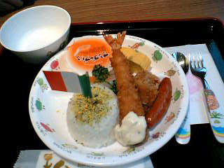 海老フライ、唐揚げ、ウィンナー、卵焼き、