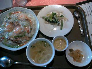 フカヒレがたくさん入ったあんかけチャーハン。あんはシャンタンで味つけられており塩ベースであっさりめ。エビやきくらげ、卵にタケノコ、椎茸等が具として入っている。