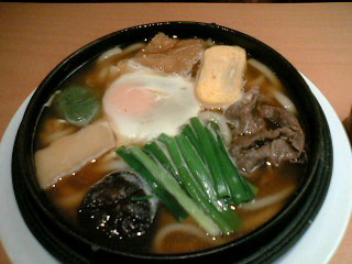 鉄釜に入った状態でくるうどん。麺は意外とモチモチっとコシがある。スープは、牛の風味はよく出ているが甘みが強く、おでんの出汁っぽい。
